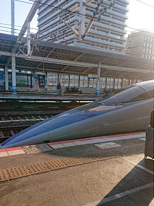 帰りの新幹線ホームで懐かしいものに出会いました。500系新幹線です。500系は約30年前にデビューした車両で、当時は「のぞみ」として花形の新幹線でしたが、今ではJR西日本区間を「こだま」として運行しています。ただ、その未来感あふれる姿から未だにファンは多く、yamanekoも含め昔出張のときに乗っていた感のあるおじさん数人が写真を撮ってました。