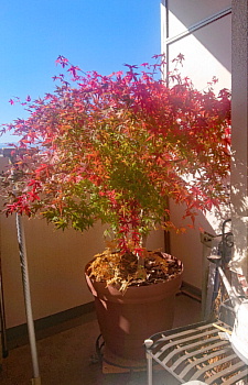 今年もベランダのモミジが紅葉し始めました。やっぱり例年よりも遅めです。モミジは水辺のような湿った場所を好む植物。鉢植えでは水を切らすとすぐに葉へのダメージとして現れます。この時期にきれいな紅葉を見るためには一年を通してたっぷりな水やりが欠かせません。ただ、適当に剪定したせいか変な樹形になっているのが残念です。