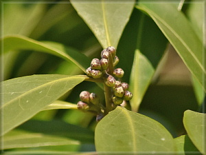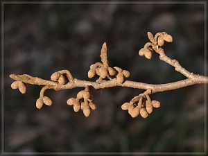 葉腋に蕾が密生しています。クロキの蕾にはほとんど柄がなく、また花序の軸も短いので、こういう状態になるようです。春になってここに花が密集して付く様子は面白いです。