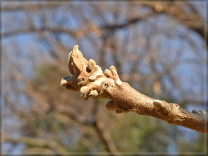 おお、これはいかにもクルミの冬芽ですね。ごついです。プレートにはヒメグルミとありました。あのポピュラーなオニグルミの変種だそうです。オニグルミに比べ果実が小ぶりなのでヒメグルミです。形もやや扁平。