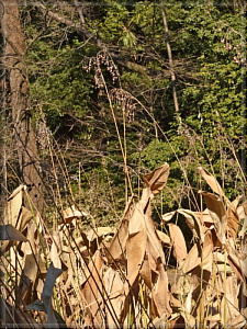 池の畔に枯れ立ちした植物が。プレートを見るとミズカンナとあります。確かに大ぶりな葉はカンナのそれです。北アメリカ原産でクズウコン科だそう。聞いたこともない科名です。