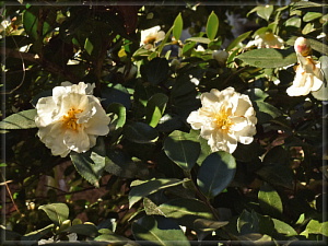 白花のサザンカ。品名は久留米白寒椿だそうです。寒椿、サザンカなのに。