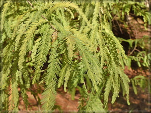 ラクウショウの葉が青々としているぞと近づいてみたら、ちょっと様子が違いました。プレートには「メキシコラクウショウ」とあります。メキシコにもラクウショウがあるんだ。葉は黄緑色をしていて、触るとしなやかです。日本のラクウショウは、この時期は葉が褐色に乾燥していて、ほぼ散り散りに落ちて木は骨格だけになっています。何しろ「落羽松」ですから。一方、メキシコラクウショウは暖かい地方の原産だけあって常緑樹で、新しい葉と順次入れ替わりで古い葉が落ちるのだと思います。だったらと幹の周りを見てみると、褐色になった葉が一面に散っていました。でもまてよ、春ではなくこの時期に葉が入れ替わるということ?