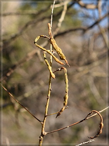 エンジュの豆果が枝に残っていました。瑞々しい頃の果実は枝豆のように肉厚で、数珠状にくびれがあるのが特徴。今の姿は干からびたインゲンですね。ちなみに、漢字では「槐」で、木偏に鬼と書きますが、原産地の中国では縁起の良い樹木とされているのだそうです。