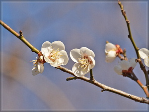 薄桃色の方の品種は「未開紅」だそう。どういう意味? 紅梅の蕾の頃の色合いだということだろうか。そんな単純なことではないでしょうね。