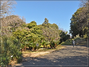 園内に入ると正面に坂道が続いています。南西向きの雛壇構造のうちの上の段に続く道です。日当たり良好。仮にこのエリアが民間に放出されたら、きっと超高級住宅地になるでしょうね。