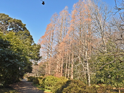 こちらも大きさでは負けていない、というか優っているメタセコイア。メタセコイアといえば、太古に絶滅したものと考えられていたのが昭和20年に中国四川省で生き延びているものが発見され、まさに生きた化石として話題になったというエピソードが有名です。ここのものはその中国の株から採取した種子から育てたものだそうです。精子発見のイチョウにしろ先ほどのソテツにしろ、なんか由緒正しい樹木が普通にありますね。