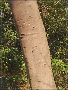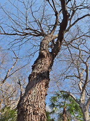 荒々しい木肌の巨木です。プレートには「チャンチンモドキ(雄)」とありました。ウルシ科の植物で、中国、東南アジア北部、ヒマラヤに分布し、日本でも九州には自生しているようです。チャンチンモドキという名前からすると本家のチャンチンという植物もあるわけで、こちらの方はセンダン科なのだそうです。チャンチンは漢字では「香椿」。花は白色で、チャンチンモドキの赤褐色の花とは似ていないとのこと。いったいどの部分を見てモドキなのか。