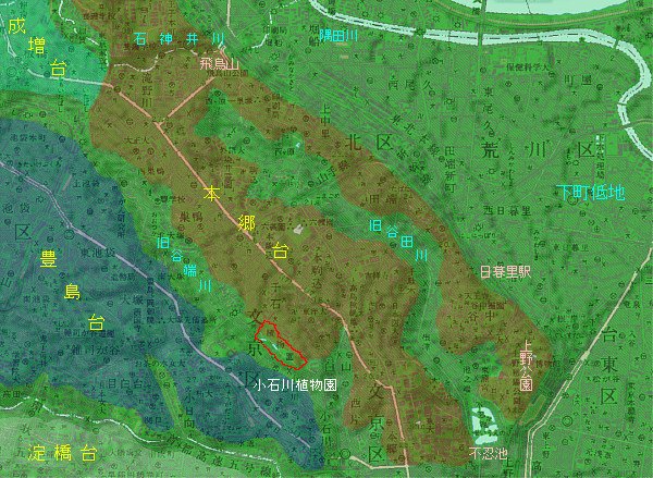 武蔵野台地の東端部は小さな川に細かく開削され、本郷台、成増台、豊島台、淀橋台、荏原台などのいくつかの小台地に分けられています。小石川植物園は細長く延びた本郷台の縁に当たり(赤線で示した範囲)、南西向きの雛壇状になっています。