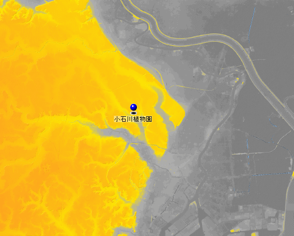 都心というと茫洋たるビル街の広がりをイメージしますが、都心の地形は案外複雑です。上の図は標高5mのところを黄色に、そこから標高が高くなるほど茶色くなるように着色したものです。特徴的なのは西と東とでその様相がまったく異なること。西側は武蔵野台地の東端に当たり、低地との標高差は先端部で20mほどになります。台地の上は細かく浸食されているのが分かりますね。一方、東側は低地が広がり、荒川下流域ではいわゆるゼロメートル地帯も見られます。小石川植物園は台地の先端部に切れ込んだ谷の途中に位置していて、園内に結構な高低差のある地形を持っています。(画像にマウスオンで地図表示)