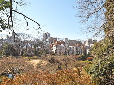 上の段に向かう階段の途中、振り返るとこの風景です。ここが都心のド真ん中であることをあらためて認識しました。正面のビル群は豊島台の上に建っています。標高はこことほぼ同じ。間を谷端川が削ったということですね。