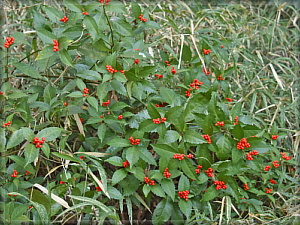 ササ藪の中にセンリョウの株がありました。そういえばセンリョウを庭以外で見ることはあまりないような気がします。マンリョウの場合、鳥が種子を運んで竹藪や雑木林に逸出しているのをよく見かけますが、センリョウの実は鳥に好まれないのでしょうか。と思って調べてみると、むしろマンリョウよりセンリョウの方が鳥に好まれるのだそう。ということは、藪の中では発芽や生育が難しいということか。