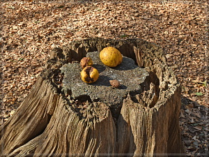 以前来たときには林床にカリンの実がたくさん落ちていて、そこから甘い匂いが漂っていましたが、今回はきれいに片付けられていました。切り株の上に誰かが置いたものが残っているのみ。