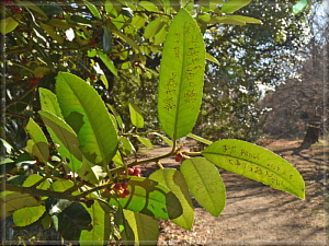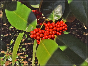タラヨウが朱い実を付けていました。大きさは1cmほど。堅くみっしりと付いていて、触ってもちょっとやそっとでは落ちません。