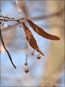 枝先にぶら下がっているのはボダイジュの実。よく見ると葉のようなものの途中から柄が伸びて、その先に丸い実を付けているのが分かります。ボダイジュの葉はもっと幅広で先端は尖り、縁には粗い鋸歯がありますが、写真のものは総苞葉と呼ばれる特殊な葉。花序の基部にあって花序を包み守る役割に特化した葉です。そのため花柄が途中まで葉と合着しているということでしょう。