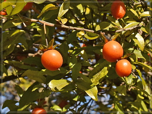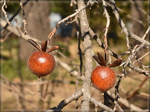 ロウヤガキの隣にはシセントキワガキという柿がありました。実のサイズや付き方はロウヤガキとほぼ同じですが、こちらの木にはこの時期でも葉が繁っています。中国四川省原産で常緑なので「四川常葉柿」なんですね。ロウヤガキは渋柿ですが、こちらは甘柿だそうです。