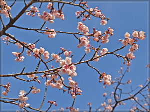 プレートには、品名「寒桜」とあり、「カンヒザクラ×ヤマザクラ」と付記されていました。名前のとおり寒中に咲いているわけですね。花はソメイヨシノに比べてやや小ぶりで、花柄が短いからか枝にしっかり付いているように見ます。ソメイヨシノのように風にワサワサ揺れるような様子はありません。