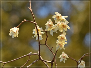坂道の脇に人が集まっているところが。寄ってみるとソシンロウバイが花を付けていました。時期が遅かったのかなんとなく花弁の色が薄いような。本来ならもう少しレモンイエローなんですが。