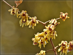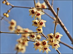 こちらは「素芯」ではない普通(?)のロウバイです。花冠の中心が花弁と同じレモンイエローなのがソシンロウバイ、花弁の色がやや濃く中心が赤っぽいのがロウバイです。