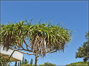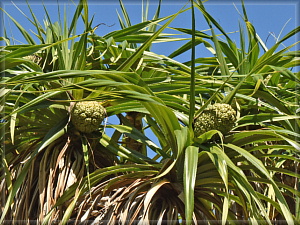 頭上にパイナップルみたいな果実が。これはアダンの実です。熟すと赤くなるとのこと。甘くていい匂いがするそうですが、ほとんどが繊維質で食用には適さないそう。もっぱら昆虫とかヤシガニなどがやってくるそうです。