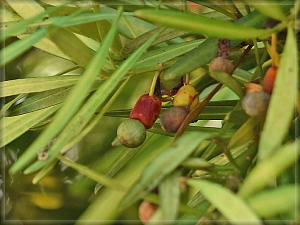 民家の防風林としてイヌマキの生け垣がありました。近づいてみると面白いものが。緑色の球形のものが種子です。果実みたいですが、裸子植物なので果肉はなく、種子が露出している状態なのです。その付け根にある赤い円柱状のものは果床と呼ばれる土台の役割を果たすもの。甘くて弾力があり、食べられるそうです。