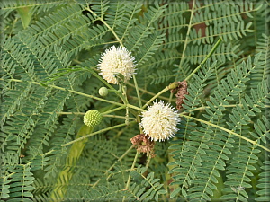 あちこちで出会い、もうすっかり馴染みになったギンゴウカン。葉はマメ科の植物によく見られる2回羽状複葉です。白い球形のものは花が寄り集まった花序。ただ果実は鞘エンドウを2倍長くして褐色に干からびさせたような姿で、それが10個くらいまとまってぶら下がるのだそうです。いったいこの花からどうやってそんな果実ができるのか。イメージ変わりすぎです。