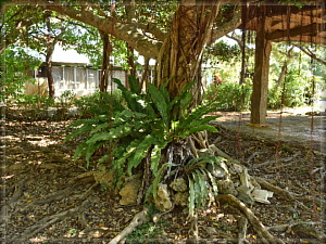 シマオオタニワタリというシダの仲間。モモタマナが造った木陰で繁っていました。南国だからかシダもビッグサイズです。
