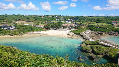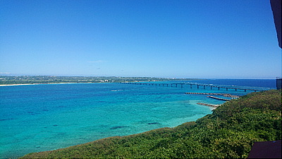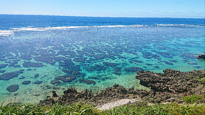 展望台から外洋を望む。手前にはサンゴの浅瀬。その奥の濃い青色のところは急に水深が深くなっています。いつまででも眺めていられる風景ですな。暑くなければ。