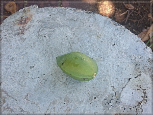 これが果実。桃の種のような形をしています。名前(桃玉名)に桃の字が入っているのは何か関係があるのでしょうか。自生する場所が海岸なのは、この果実がヤシの実のように海水に浮いて運ばれるためだそう。そういえばヤシの実をミニチュアにしたような形でもあります。