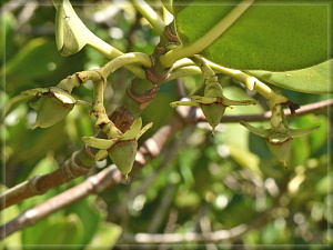 これは若い果実です。種子はこの果実の中で発芽して長さ20cmから40cmにもなる棍棒のような器官(胚軸)を作ります。写真のような小ぶりの果実から長い棒のようなものが伸び出すわけで、かなり目を引く姿です。その胚軸は成熟すると実から抜け落ち、まっすぐ落下。潮間帯のぬかるんだ地面に突き刺さり、その状態で新たな木として成長していきます。引力を利用した挿し木ですね。