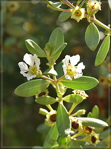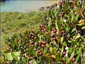 小島の外洋側の斜面にはシャリンバイの群落が。果実がたくさん付いています。この木は暖地の沿岸部でもよく見かけ、植栽されていることも多いです。