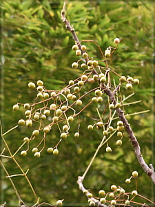 高い梢の上にセンダンが実を付けていました。広島に住んでいた頃、職場近くに街路樹としてセンダンが植えられていて、この実が歩道に散らばっていた光景を思い出します。丸い実だけではなく長い果柄もバラバラになって落ちるんですよね。ちなみに、「栴檀は双葉より芳し」の栴檀とはビャクダン(白檀)のことで、このセンダンとは別のものです。