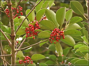 こちらはクロガネモチではなくモチノキでしょう。写真を比べてみるとやはり違いは明瞭ですね。ちなみにモチノキのモチ(糯)は鳥糯のモチで、お餅のモチではありません。モチノキの樹皮を使って鳥糯を作っていたからその名になったとのことです。でもまてよ。糯も餅もよく粘るじゃないですか。元をたどっていくと同じ意味のものだったりして。