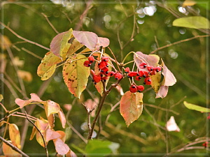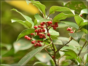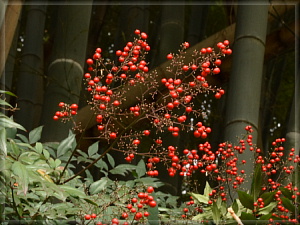 こちらはナンテンの実。昔、民家の裏などによく植えられていました。実は煎じて咳止めに、葉は強壮薬にしたそうです。現在、山野に生えているもののほとんどは庭木が逸出したものだそうで、そもそも国内の自生を疑問視する声もあるのだそうです。