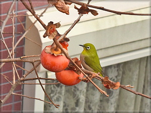 民家の柿の木にメジロが来ていました。美味しそうに柿の実を食べていました。クマは困りますがメジロなら大歓迎ですね。可愛いし。