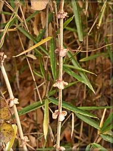 ちょっと面白いものを見つけました。これはウグイスカグラの葉柄の基部(根元部分)が枝に残ったもの。普通、葉柄は枝から細く伸びますが、その葉柄の枝と接している部分が丸い形に薄く広がり、葉が落ちてもその部分だけ残った状態です。1個の葉の葉柄で丸っこいものが2つ。ウグイスカグラの葉は対生に付くので、計4個。まるで四葉のクローバーのような形に残っているのです。これは花が付く普通の枝では起こらない現象で、もっぱら徒長枝と呼ばれる急激に伸びる枝で起こるのだそうです。(徒長枝は栄養の多くを枝の成長に振り向けるので、花芽は付きにくいのだそうです。)