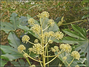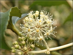 ヤツデです。大きな花序で、ちょっとしたクリスマスツリーくらいあります。右の写真は開花状態。よく見ると案外華やかですね。雌しべが成熟する前に雄しべが花粉を散らし、自家受粉を避けるのだそうです。