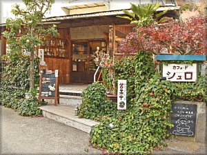 森から下りて案外すぐのところにカフェ・ド・シュロがありました。ここがお目当ての店です。何かの建物(民家ではないと思う)を改装したようなお店で、1階がケーキ屋、2階が喫茶になっていました。yamanekoたちはドリアをいただきました。ケーキも買って帰ろうと思いましたが、食事が終わるころにはケーキは売り切れてしまっていました。残念。