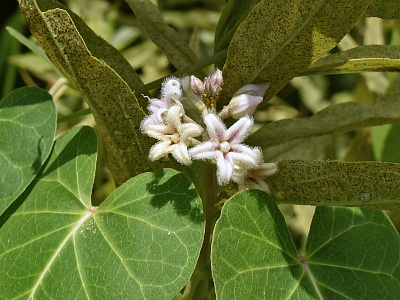 クワクサの花をアップで。葉腋に尾花と雌花が混在した丸い花序を付けていますね。4個の雄しべが飛び出しているのが雄花。初めは内側に折れ曲がっていて、それがピンと伸びた状態です。雌花は暗紅色の花柱を出すのですが、まだその状態になっているものはないようです。