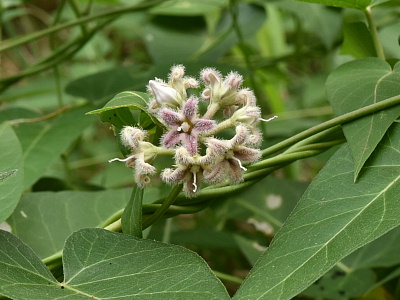 ガガイモの花序です。障害物がないとこんな風に球状に花を付けるんですね。花冠から伸びる柱頭が波平さんの頭の毛みたいで面白いです。