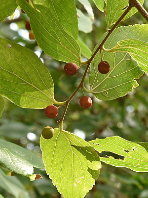 エノキの果実を見上げたところ。そろそろ熟してきているようで、果実の表面がへこんでいるのが分かります。これは中の水分が少なくなってきたから。干し柿みたいな味がします。