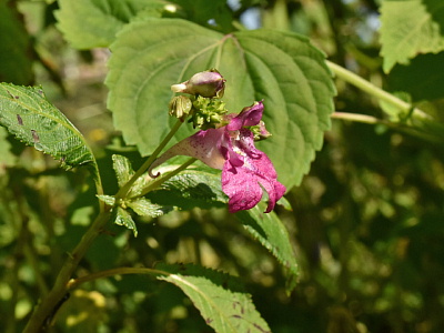 ツリフネソウの花が咲き始めました。猛暑のせいか傷みが目に付きます。