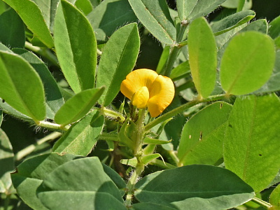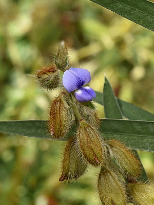 野草見本園にやって来ました。これはタヌキマメ。ラグビーボール状のものは果実ではなく蕾。これから開花していきます。この蕾の表面(萼片)が毛深いのでタヌキの名が付けられたとのことです。この花は昼に咲いて夕方に閉じるという朝寝坊型。花には朝に咲いて昼に閉じるもの(ハスなど)とか、夜に咲いて朝に萎むもの(カラスウリなど)とか様々ありますね。