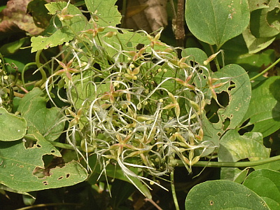 これはセンニンソウの果実。「果実群」と言った方が良いかもしれません。長い髭(花柱の名残)を持つ痩果が星状に5個付いていて、これで一つの花の果実です。これらが絡み合っている状態ですね。