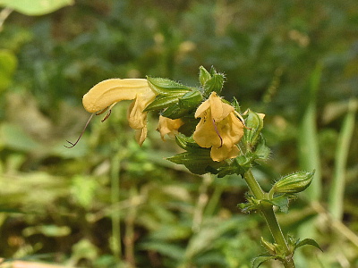九反甫谷戸にやって来ました。キバナアキギリが咲く時期です。今年は株の数が減っているような。左の花は横を向いているので観察に好都合。上の花被片は袋状になっていて先端から長い雌しべが突き出ています。その根元辺りから顔を出しているものは雄しべ。本来は袋の中に格納されています。それがハナバチが花筒に入ったタイミングでスリットのように開いた隙間から出てきて、ハチの背中に花粉を付けるという芸の細かいことをやります。