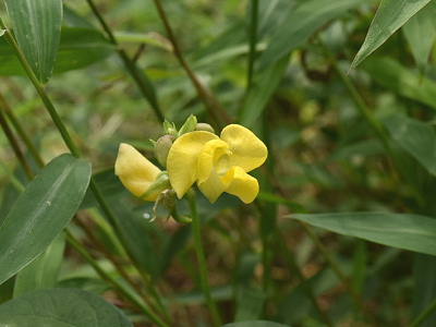 これはラッカセイの花です。片仮名だと違和感がありますが、ピーナッツができる落花生です。花はあまり見たことないですよね。普通植物の実は花の付け根辺りにある子房が膨らんでできますが、このラッカセイは子房に柄が付いていてそれがにゅーっと伸びて地面に突き刺さり、地中に潜ってそこで膨らんで実になります。