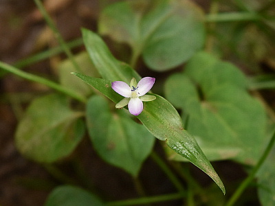 湿った場所を好むイボクサ。地面に這いつくばるようにして生えています。花の大きさは大きいものでも1cm弱。花弁の先端は赤紫色、雄しべの葯は青紫色とパステルカラーで、ファンシー(死語)です。なのに名前がイボとは。これは葉の汁を付けるとイボが取れるという言い伝えから付けられたのだそうです。