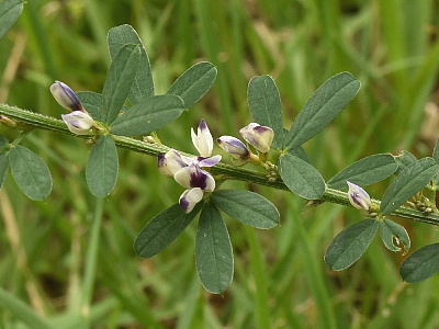 芝生の上を這うハイメドハギ。メドハギの変種だそうです。その名のとおり茎の基部が地を這うように伸びています。花をアップで見ると紫色の斑紋が綺麗ですね。普段は気付かずに踏みつけて歩いたりしていて、申し訳ないです。
