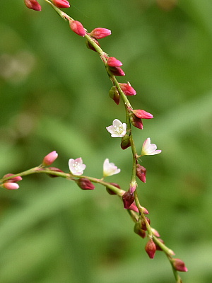 このミズヒキの花も極小。イタドリよりもワンサイズ小さいです。花被片は4つに裂けていて、上3つは紅く、下1つは白いです。ミズヒキはイタドリと同じタデ科で、この科の花は小さいものが多いです。