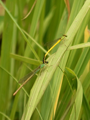 交尾前のキイトトンボ。前がオスで後ろがメスです。オスの尻尾(腹部)の先には把握器という器官があって、これでメスの首根っこを掴んでいる状態です。この後、メスが尻尾を丸めてその先端にある生殖器をオスの胸近くにある生殖器に結合させて交尾成功。2匹のこの状態がハートマークに見えほのぼの感があるのですが、オスがメスを掴んでいるのは自分が交尾したメスを他のオスに盗られないようにするためなのだとか。うーむ…。